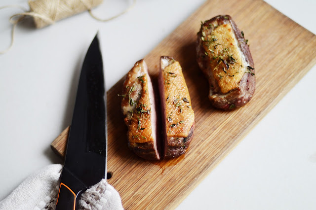 5. Aseta fileed küpsetuspaberiga kaetud ahjuplaadile. Maitsesta pardi naha pool soola, pipra ja värske tüümianiga. Seejärel pane part 75 kraadisesse ahju 50 - 60 minutiks küpsema.